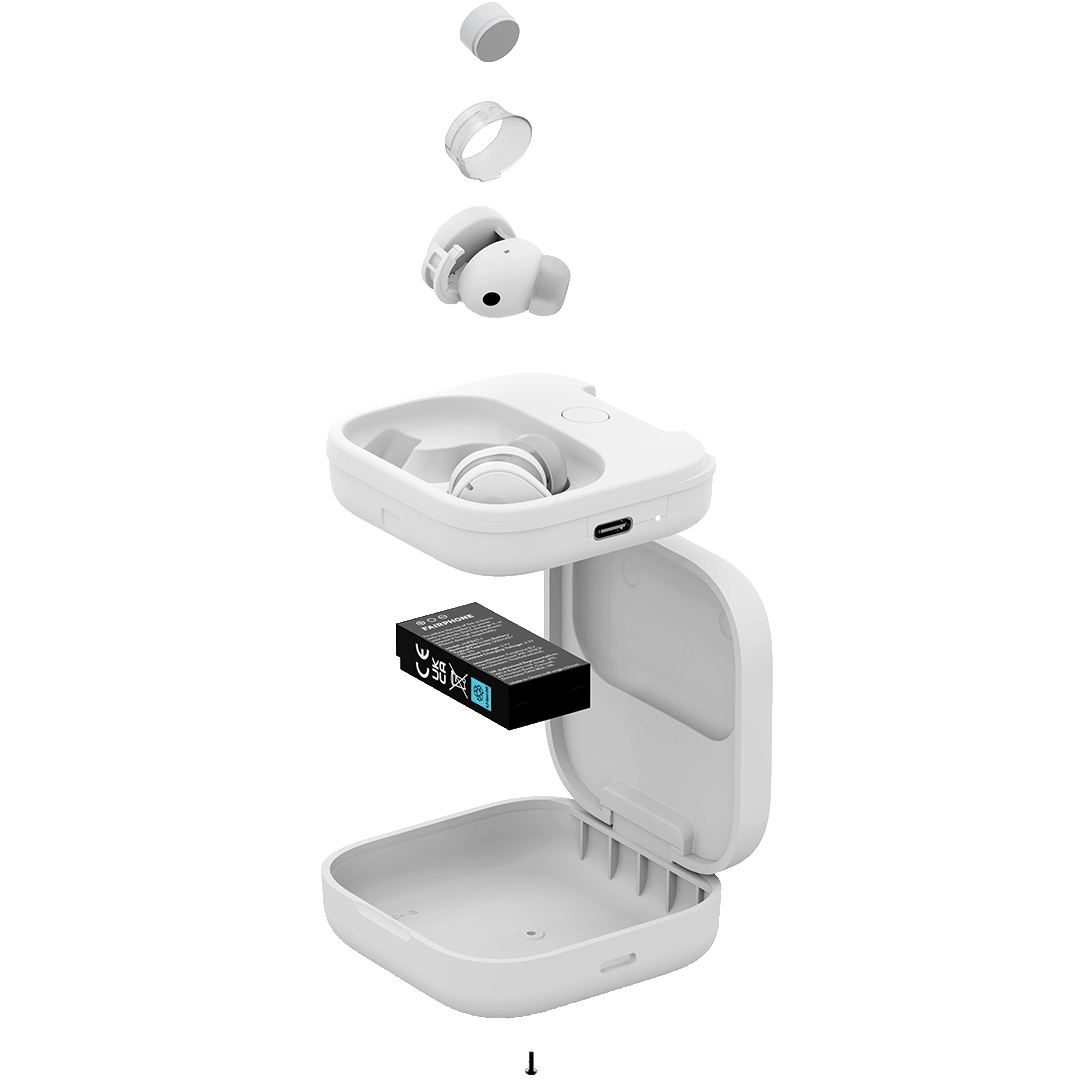 | Führende Langlebigkeit und Reparierbarkeit | ● Reparierbares Design, bei dem alle Batterien (Kopfhörer und Ladebox) sowie das Ladebox-Gehäuse ausgetauscht werden können ● Erweiterte 3-Jahres-Garantie ● IP-Schutzklasse 54 ● Verlorene Kopfhörer können separat bestellt werden |